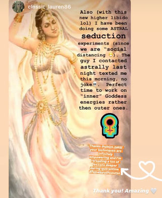 This course presents teachings over the months, 1 per week through an email document, focusing each week on a range of essential elements for women in spirituality: self-development topics such as the body, glamour, asana, journaling, lunar adorations for women, exploring realms, dream working, techniques of lunar magick, your unique sexuality, methods to contact and control your daemon/kundalini (so that one learns to gain any knowledge they desire through Gnosis, without the need for any teacher or authority figure to submit to), rituals (including things such as spiritual protection from evil eye or astral invasion-- things women are often susceptible to), getting in touch with one's ancestors, the three degrees of sexual magic, which goddess energies and demoness you embody, body acceptance, increasing magnetism, attracting the soulmate, omens & synchronicities, cutting off past lovers, 12-week focus on connecting Rahu & Ketu, and much, much more.
